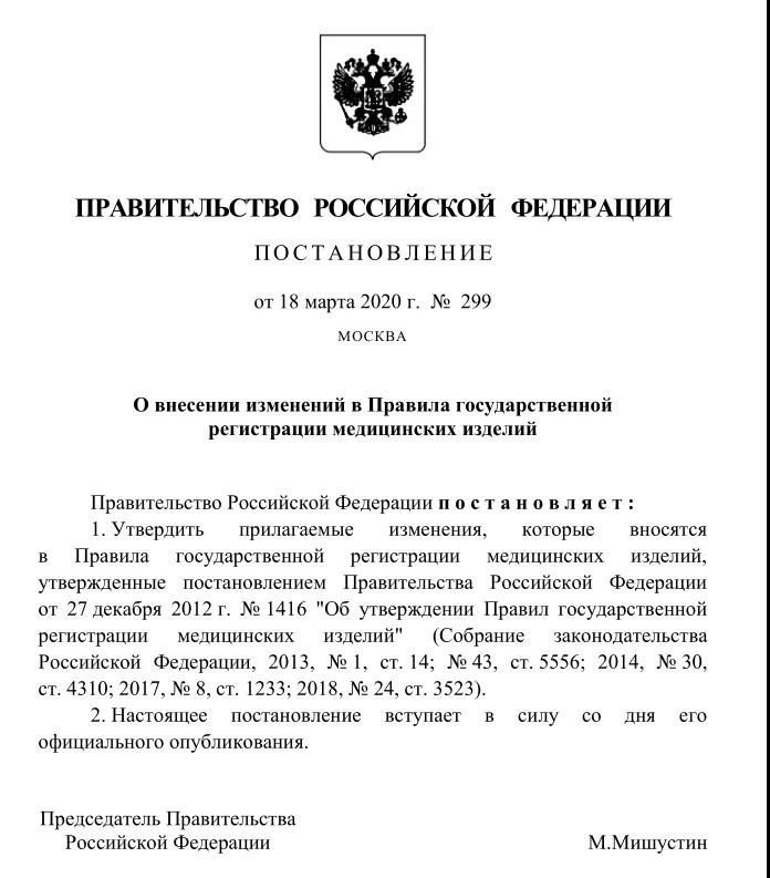由于新冠状病毒的日益严重,俄罗斯联邦政府主席米哈伊尔·米舒斯汀于2020年3月18日签署了第299号法令,批准了已建立国家特别登记程序的医疗器械清单。