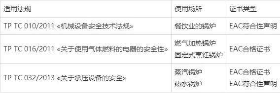 根据锅炉设备所属的海关联盟技术法规的概况,EAC认证评估的形式可以采取:EAC符合性声明或EAC认证的形式。